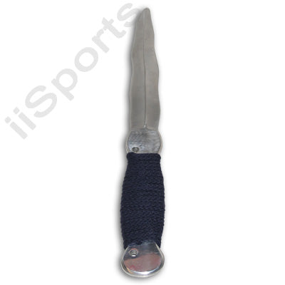 High quality aluminum Kris dagger training knife. The blade is extra thick (can be easily covered in chalk for marking cutting points) and tapered for a more realistic feel. The hand wrapped black nylon cord provides a secure grip for performing the most rigorous training drills. No cut out holes for a heavier feel. Will not cut flesh. 11" x 1.25" x .25"; .39 lbs.