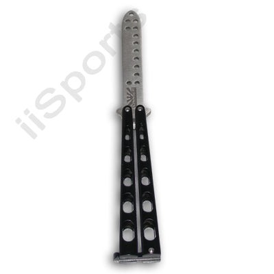 Ronin Gear's #225 Practice Butterfly knife features a 1.25" wide, rounded, perforated dull blade (blade cannot be sharpened!) that is ideal for safe training! High quality metal construction with optimal weight and balance. 5" closed, 4" blade. Legal under most state & local laws as it is a 'training replica' and cannot be made into functional knife. CANNOT BE SHARPENED! Gloss Black slotted handles.